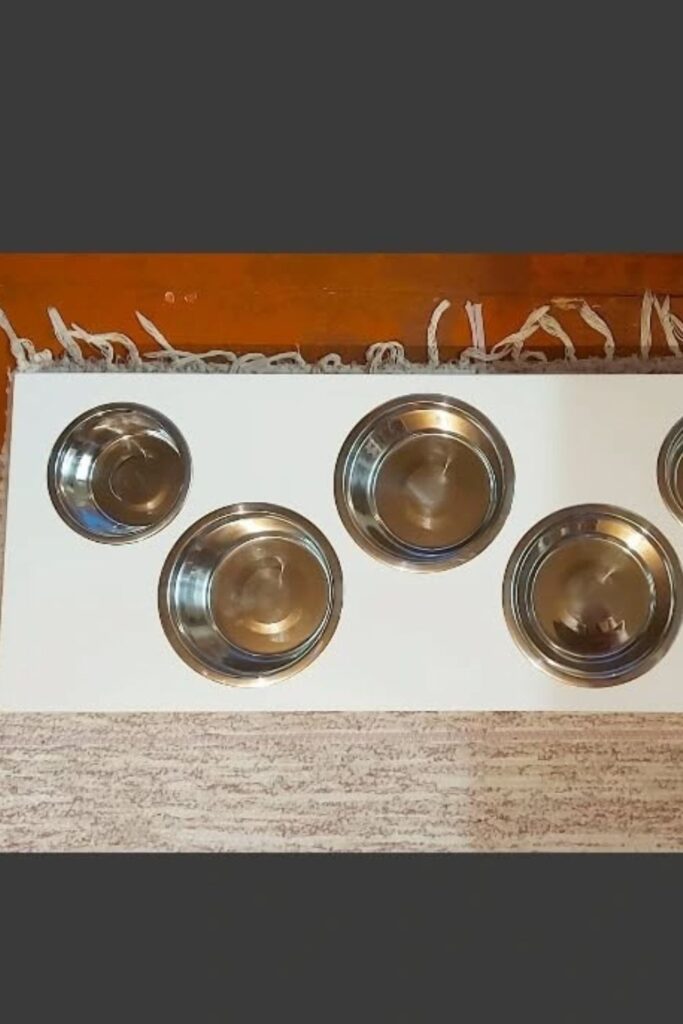 Transform your feeding routine with a white tray designed to hold six stainless steel bowls, perfectly spaced for harmony during mealtimes.