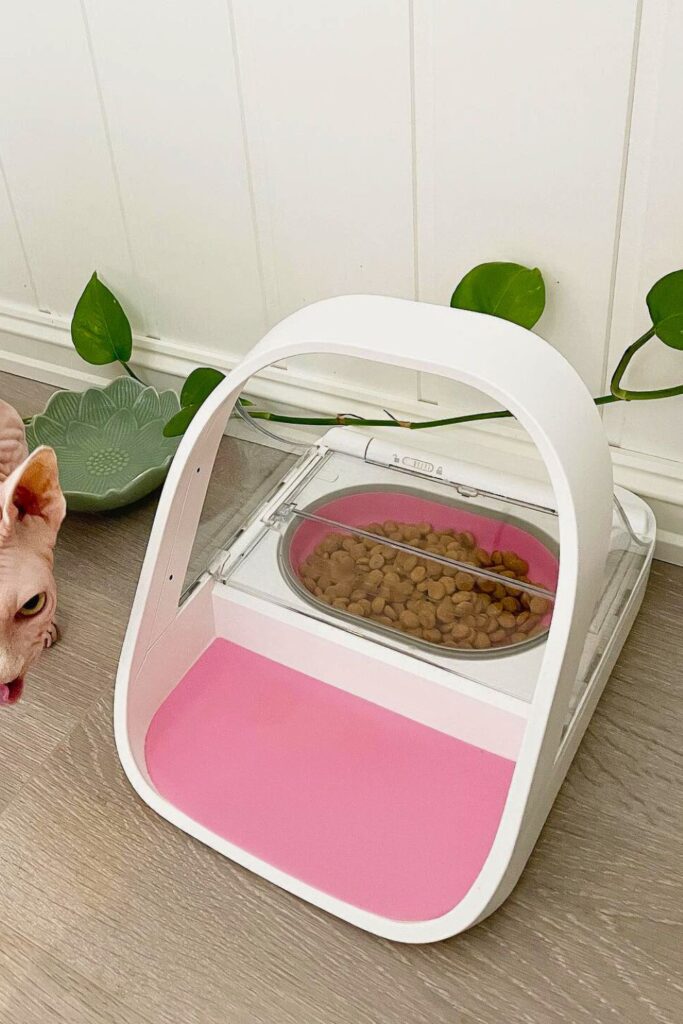 Showcasing a stylish, high-tech design, this setup pairs an automated litter box with a sophisticated food station for ultimate convenience.