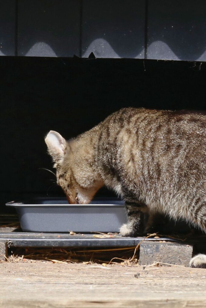 With a basic tray and bowl, it creates a discreet yet effective place for community cats to dine.