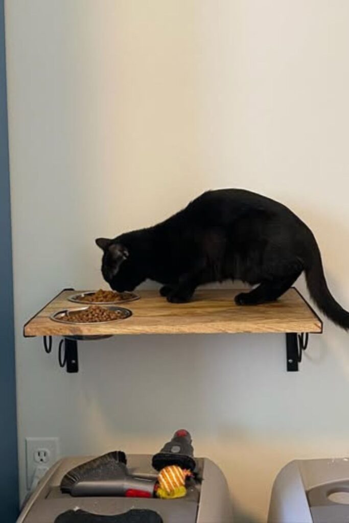 Enhance your cat’s dining comfort with a wall-mounted, raised feeding station.