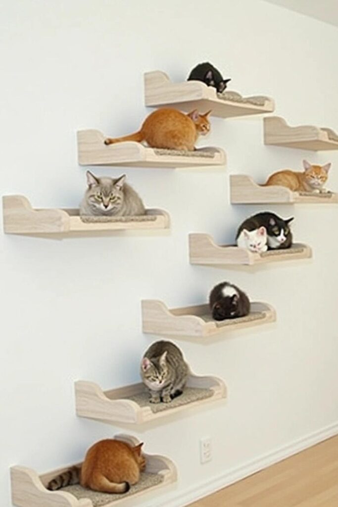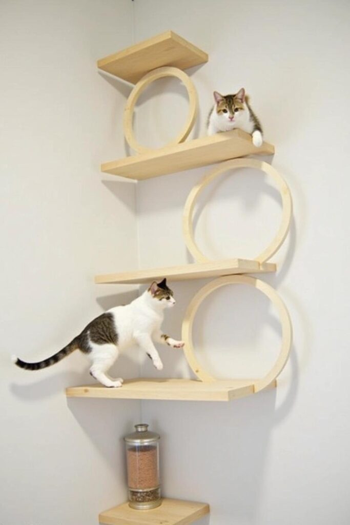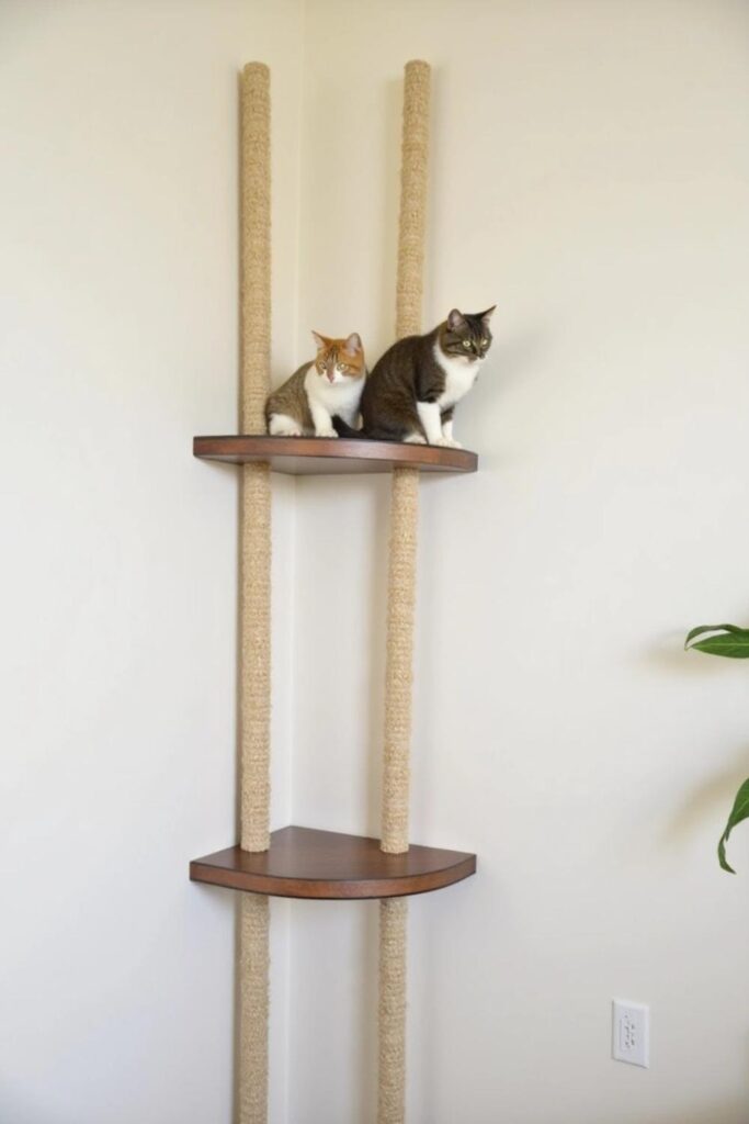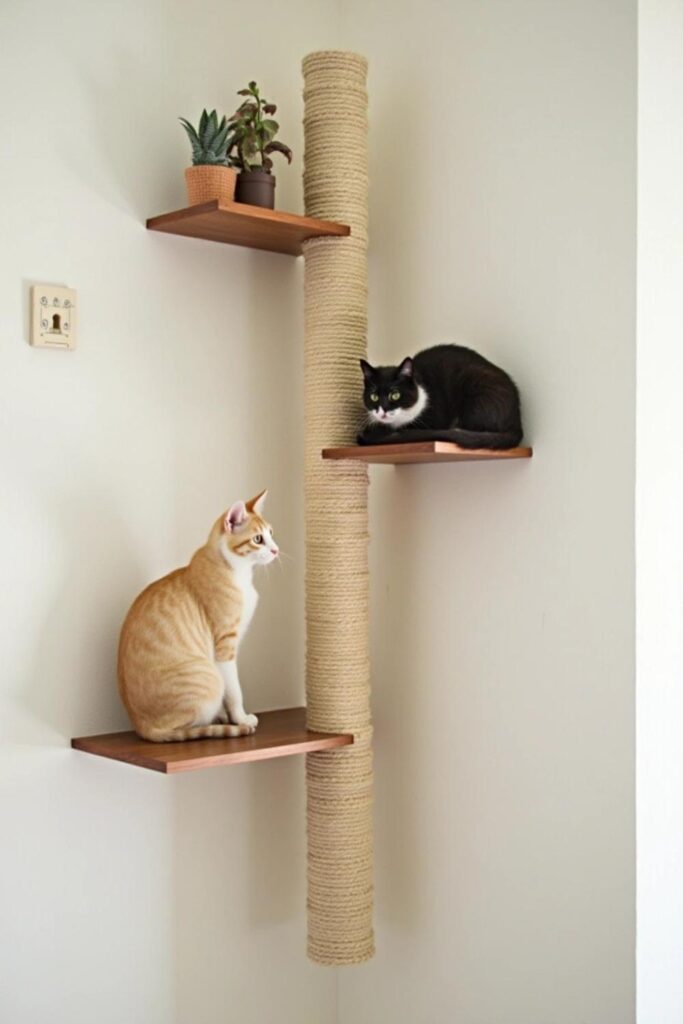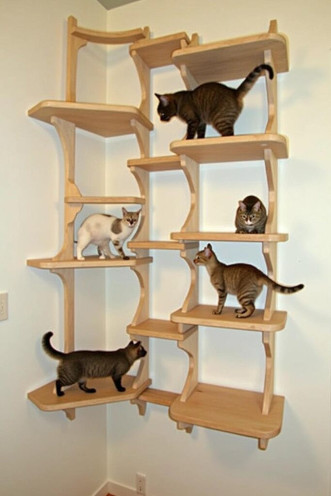Craft versatile cat shelves that double as scratching posts. Cover each shelf with durable materials like sisal to promote natural scratching behavior.