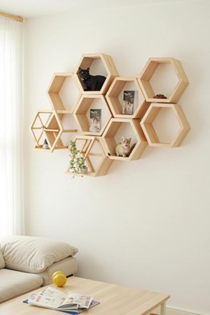 Craft a modern masterpiece with the honeycomb hideaway. Use interconnected hexagon-shaped shelves for a geometric look your cat will adore.