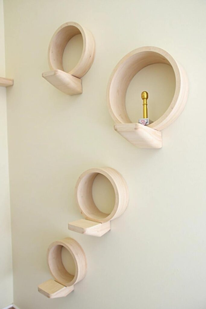 To get this look, craft smooth wooden circles with hollow centers, giving your cats cozy spots to relax.