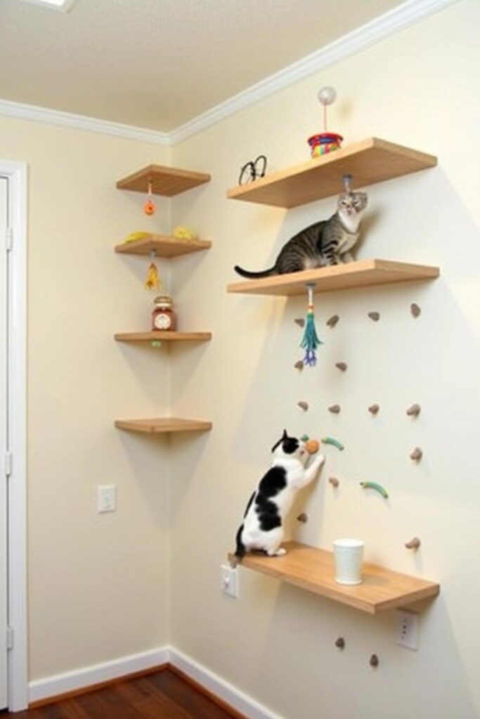 Install floating shelves at varying heights to encourage climbing and jumping.