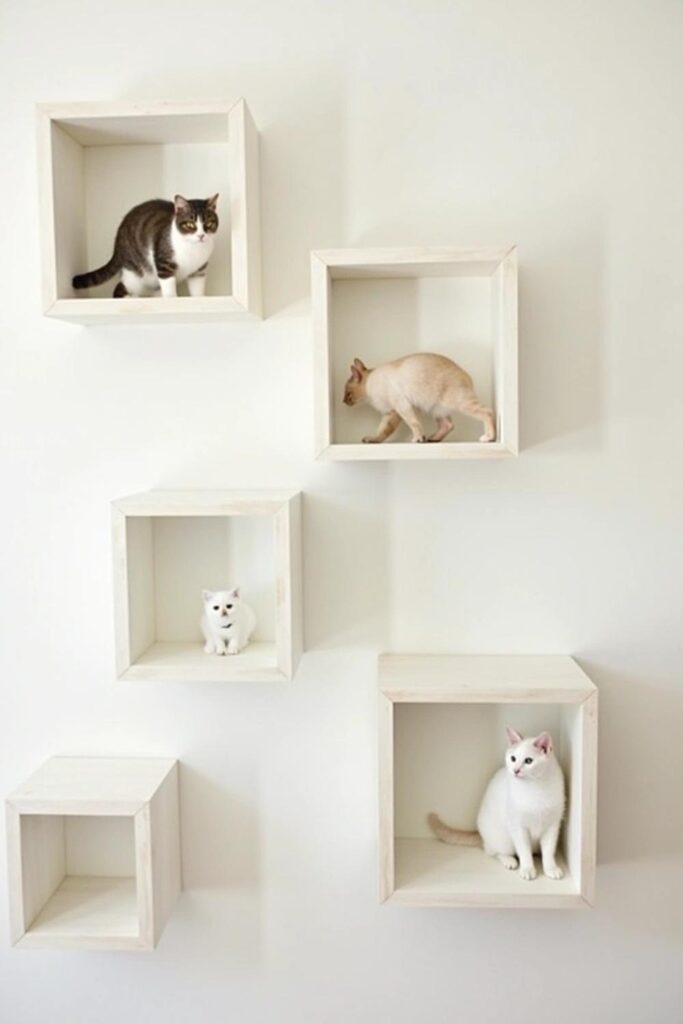 The clean lines and uniform color keep the wall looking organized, while the varying depths of the shelves add an element of interest for the cats and visually for the home.