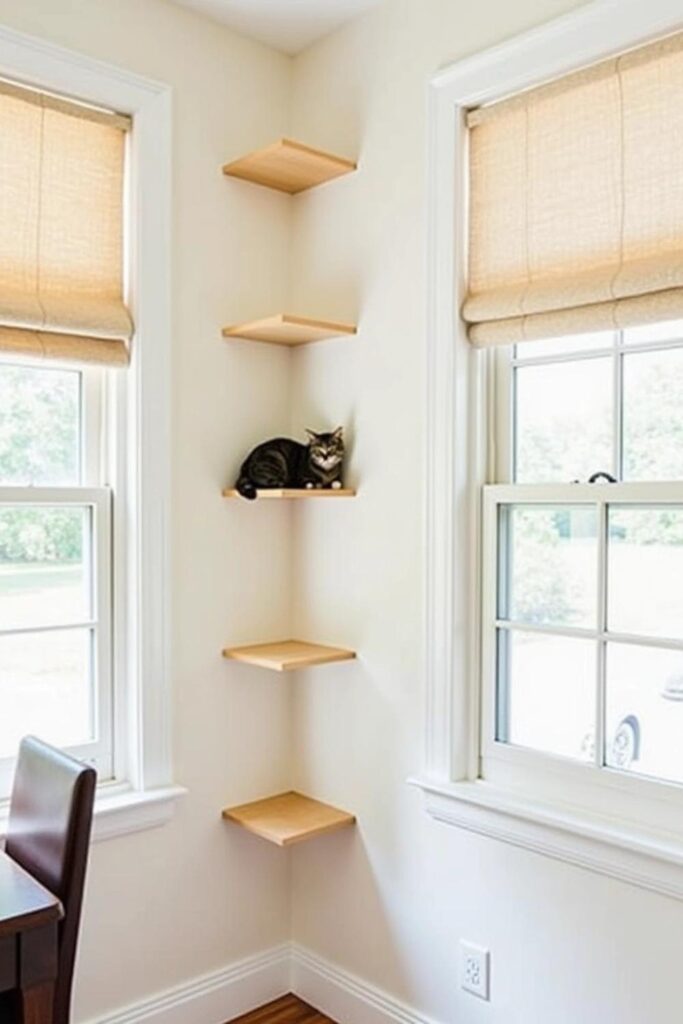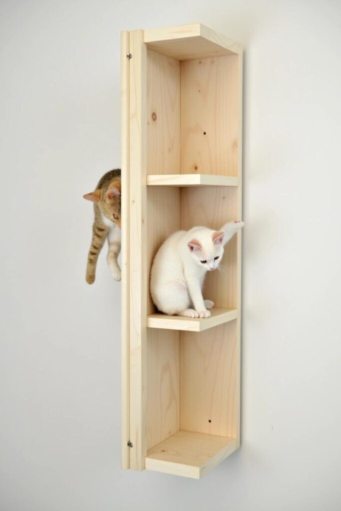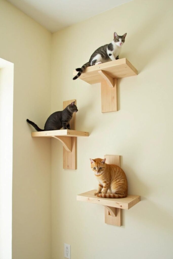Create a structured climbing haven for your cat with tri-level perch pads. DIY by spacing three sturdy shelves evenly to form a vertical play zone.