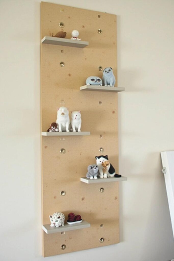 Transform your space with a dynamic pegboard climbing wall that’s both fun and versatile. Install a floor-to-ceiling pegboard and add tiny shelves for cats to climb and perch.