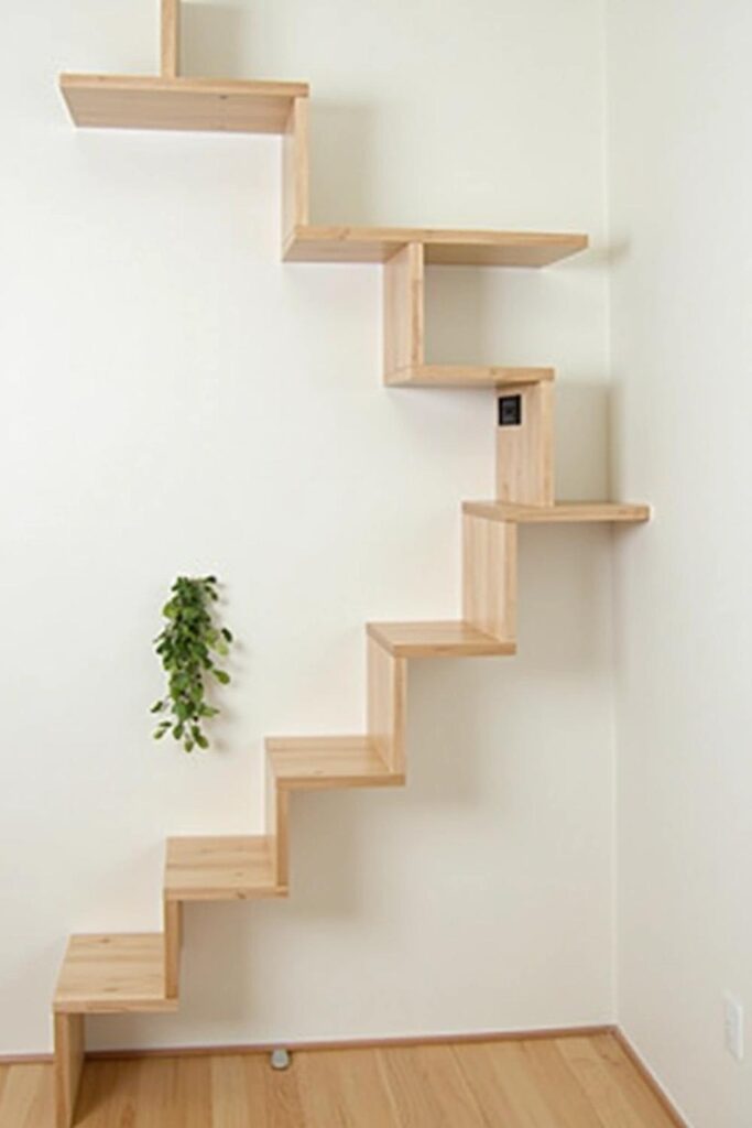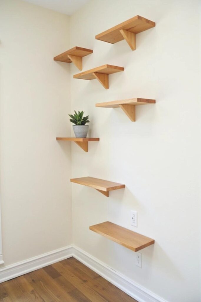 Create a staircase effect with these ascending wooden shelves, offering both style and function.