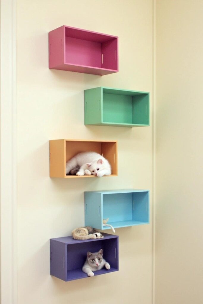 Turn your wall into a playful paradise with colorful cube retreats. Build box-shaped shelves and paint them in bright, inviting colors to catch your cat’s eye.