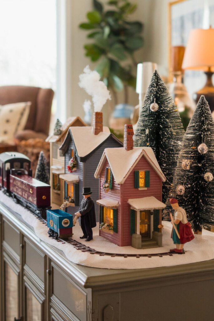 Infuse nostalgia into your decor with a Christmas Village Setup on a console table or shelf. Picture tiny houses, snow-dusted trees, and miniature figures that tell a story of holiday charm.