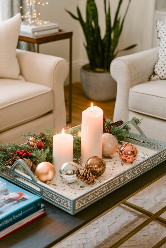 Give your coffee table a festive makeover with a holiday-themed tray. Picture this: candles flickering gently, small ornaments glittering, and lush greenery bringing life to the room.