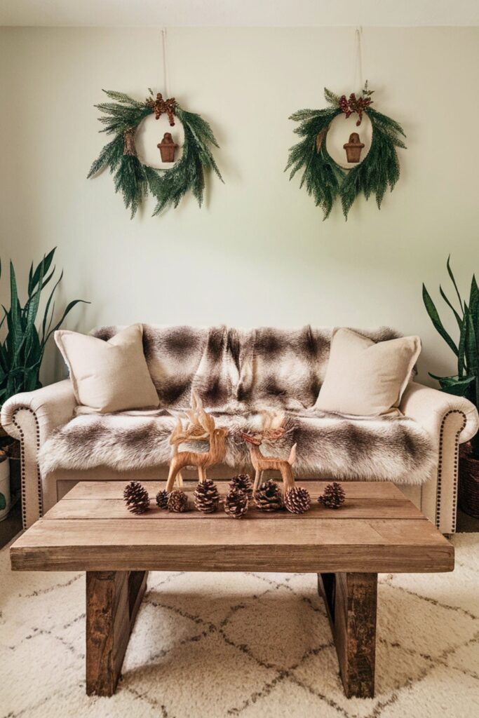 The rustic elements blend harmoniously with the holiday decor, making your living room feel like a charming cabin retreat.