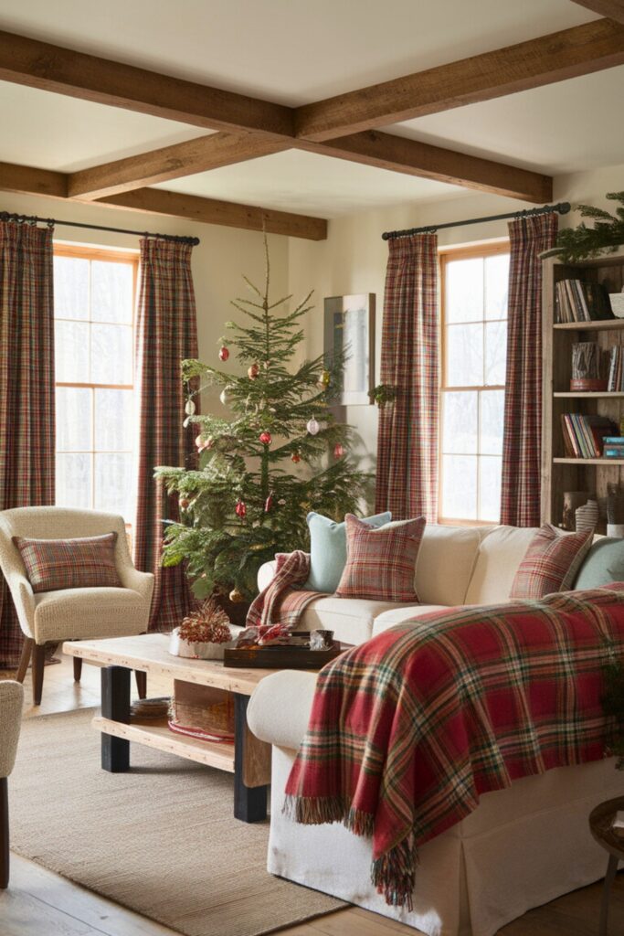 Introduce a touch of classic charm by integrating plaid throughout your living room. Opt for plaid blankets, pillows, or even curtains to evoke a cozy, cabin-like vibe.