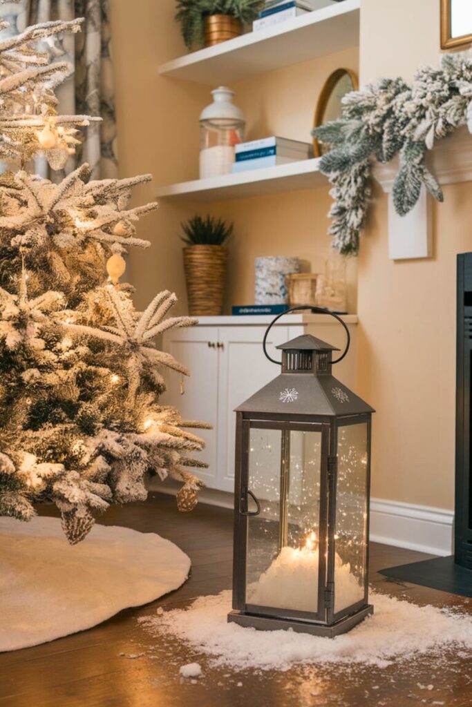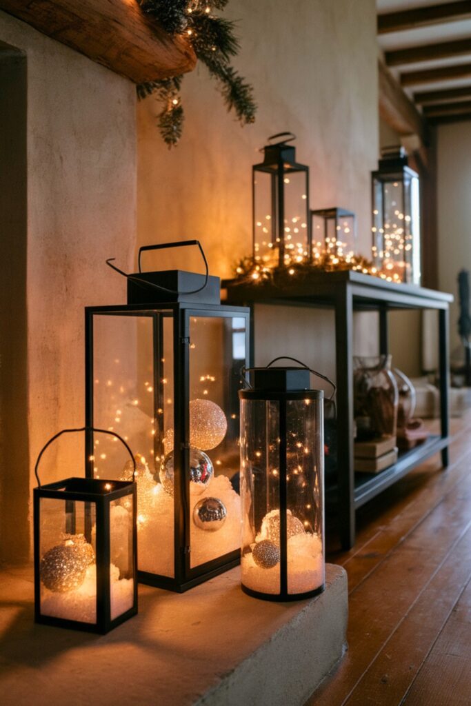 Craft a cozy winter wonderland in your living room with a collection of rustic lanterns. Arrange lanterns of varying sizes on your fireplace or a console table, filling them with faux snow, sparkling baubles, and soft LED candles.