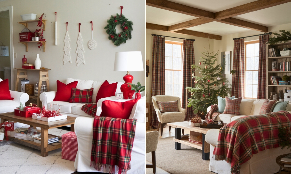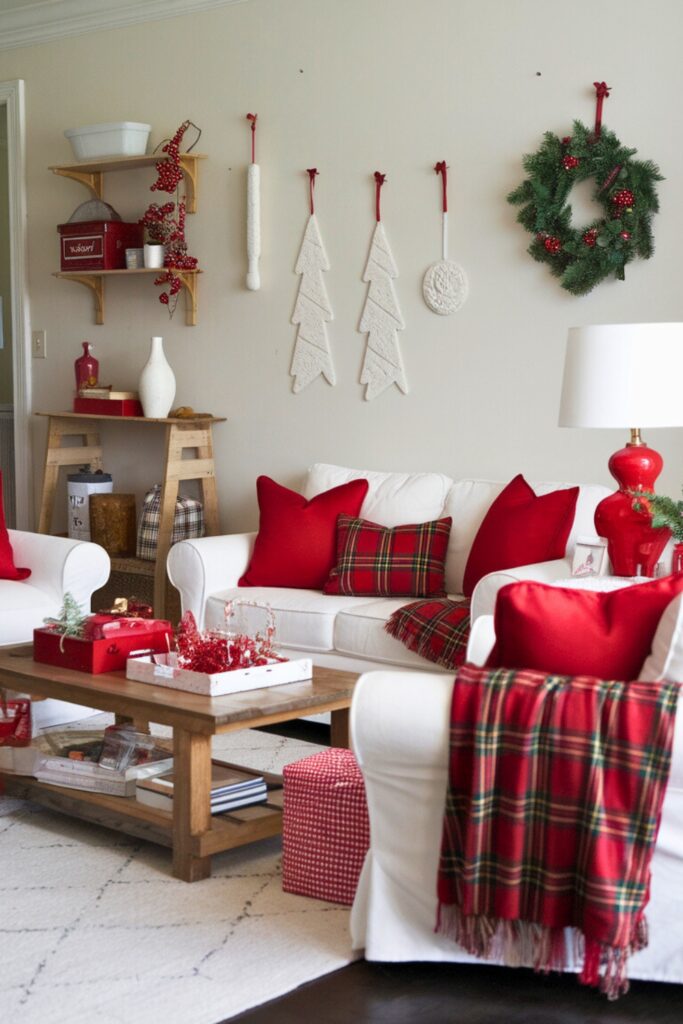 Embrace the classic holiday charm with a red-and-white color scheme. Adorn your living room with red cushions, plaid throws, and simple white decorations to evoke the spirit of Christmas.
