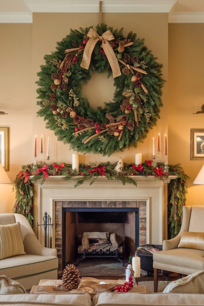 Elevate your holiday decor with a lush, eye-catching wreath placed above your fireplace or on a prominent wall.