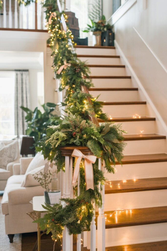 Transform your staircase into a stunning holiday feature by wrapping it with lush greenery, twinkling fairy lights, and festive bows.