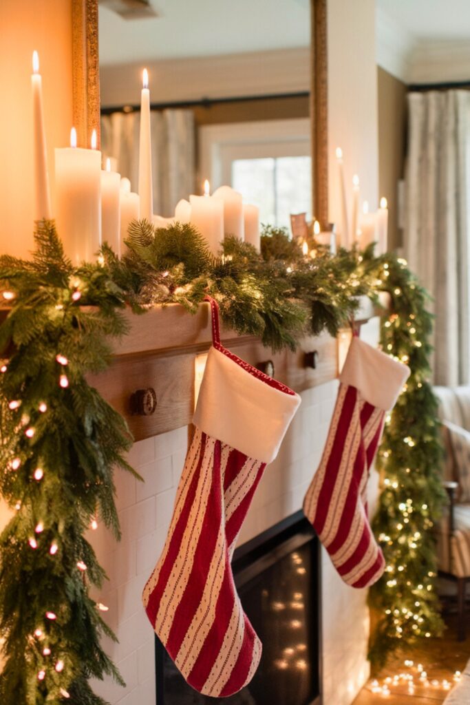 Transform your living room’s mantel into a festive masterpiece with an enchanting blend of evergreen garlands, twinkling string lights, and classic stockings.