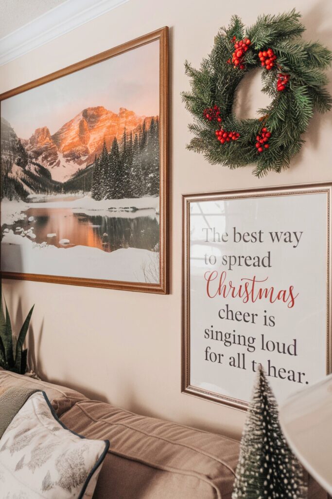 Breathe new life into your living room by swapping out your regular wall art for holiday-themed pieces. Opt for framed prints of winter landscapes, whimsical Christmas quotes, or DIY wreaths to bring the festive spirit to your walls.