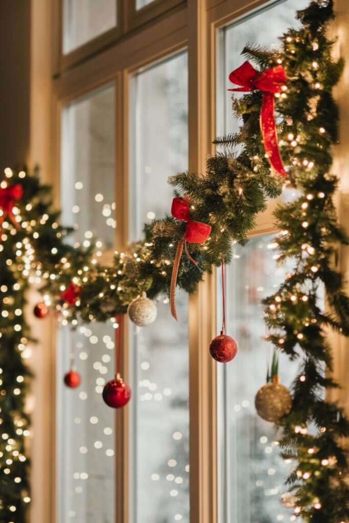 Enhance your windows with a Twinkling Window Garland that brings magic both indoors and out. Drape a lush garland adorned with fairy lights along the window frame.