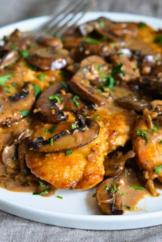 Then, let them simmer gently in a savory sauce made from Marsala wine, earthy mushrooms, and tasty chicken broth.