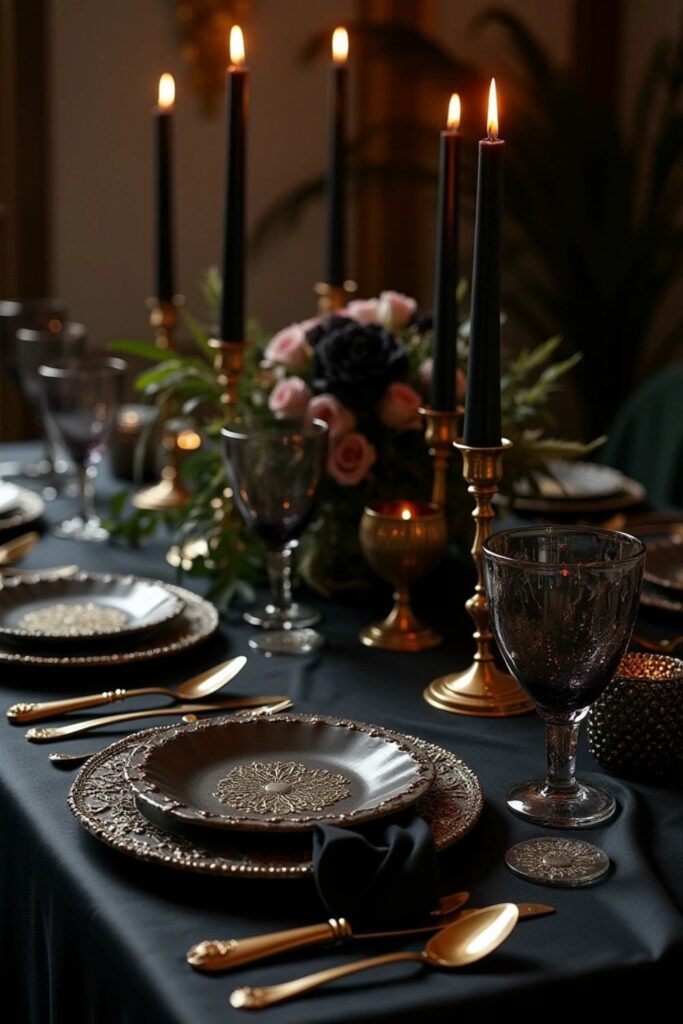Add deep red flowers to soften the effect, and illuminate the space with golden candleholders for a warm, romantic glow.