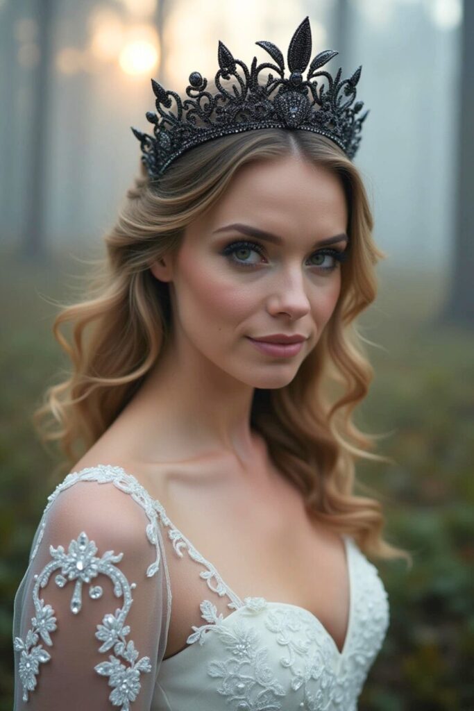 Elevate your bridal look with a metallic crown adorned with dark crystals. This stylish addition will make you feel like royalty in your fairytale wedding.