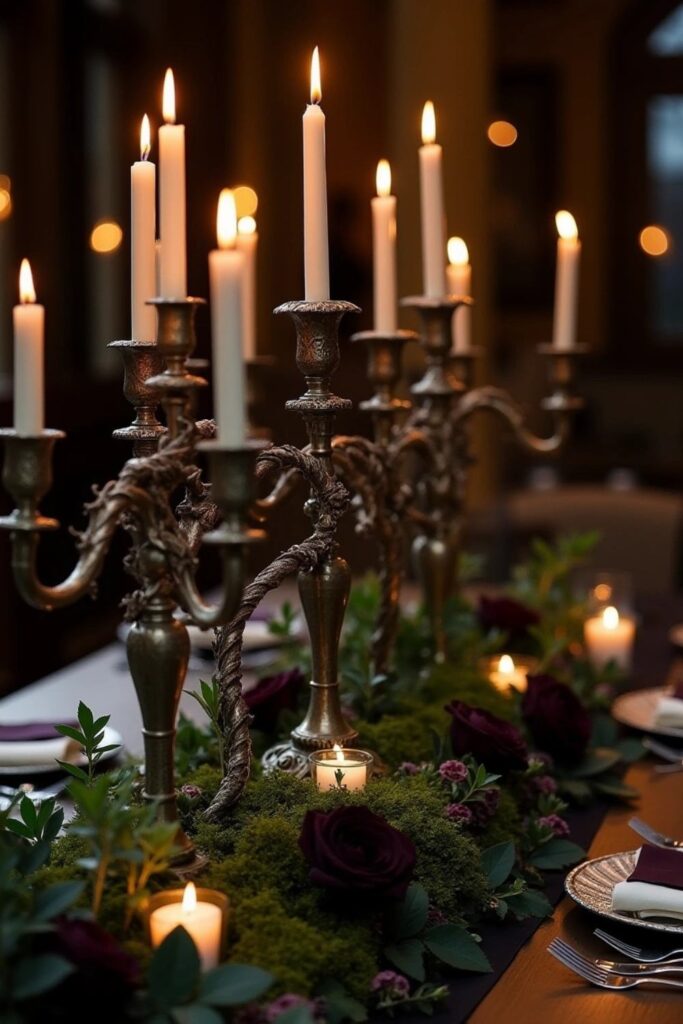 Turn your tables into enchanted havens with antique candelabras, clusters of dark roses, winding ivy, and soft layers of moss.