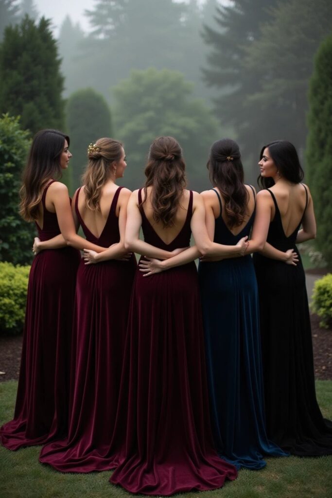 Transform your bridesmaids into ethereal figures with rich velvet gowns in shades like deep burgundy, midnight navy, or classic black.