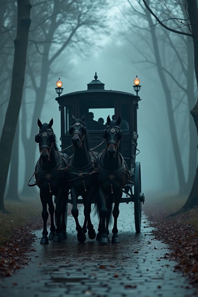 Make a grand entrance in a gothic-style horse-drawn carriage, draped in cascading dark flowers and dotted with glowing lanterns.