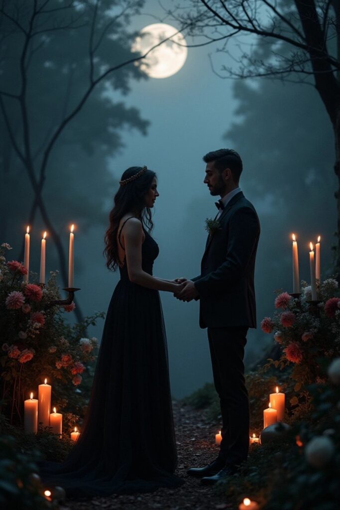 This combination creates a striking gothic elegance, perfect for a memorable and dramatic celebration.