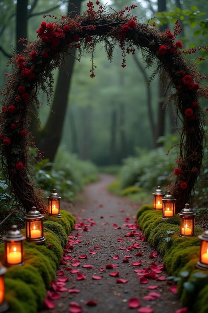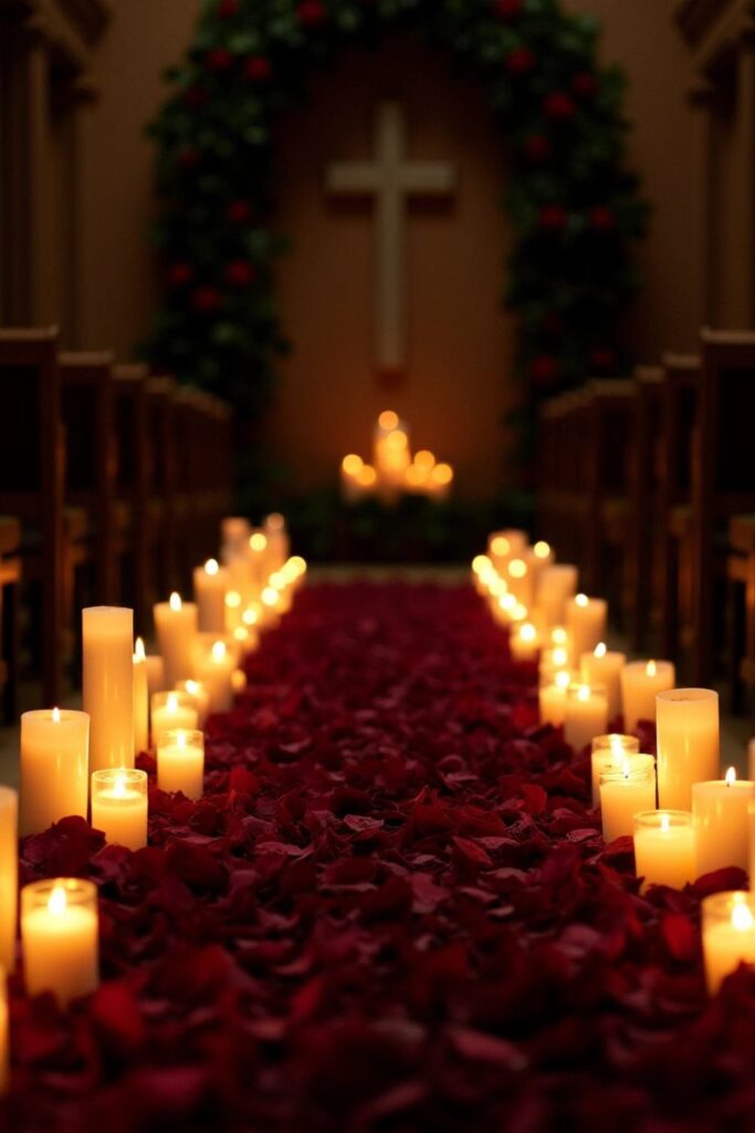 Create a dreamy ceremony with an aisle lined by candles of all sizes casting a soft, flickering glow. Scatter dark rose petals along the floor for a touch of romance.