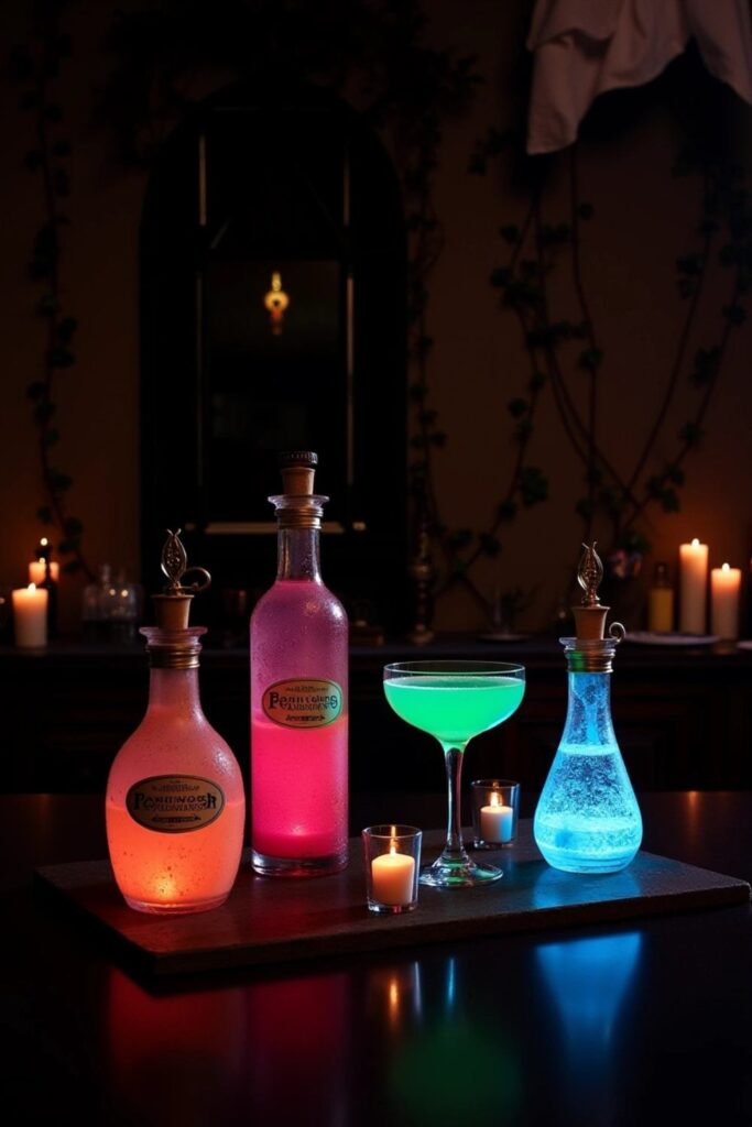Craft a whimsical potion bar for your cocktails. Serve magical drinks in vintage bottles and goblets, surrounded by candlelit ivy and eerie glowing accents.