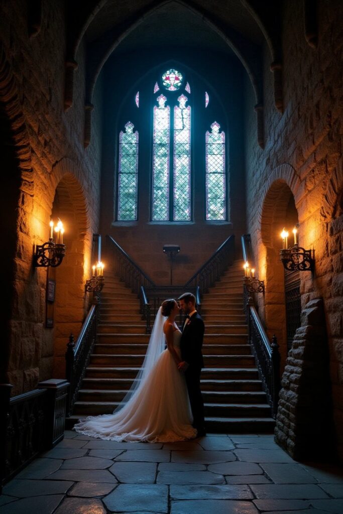 Say “I do” in a gothic castle surrounded by arched windows, stone walls, and towering spires. The venue itself becomes a timeless masterpiece with its dramatic details.