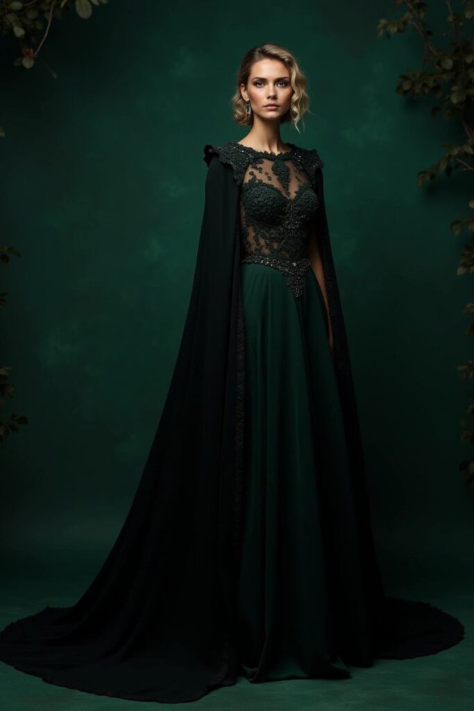 Step into a storybook with a black or emerald gown adorned with delicate lace and shimmering details.