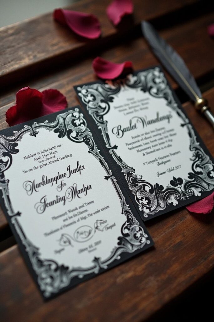 Set the tone with black velvet invitations featuring silver calligraphy and mysterious floral designs. Seal them with wax stamps and add elegant details like embossed patterns.