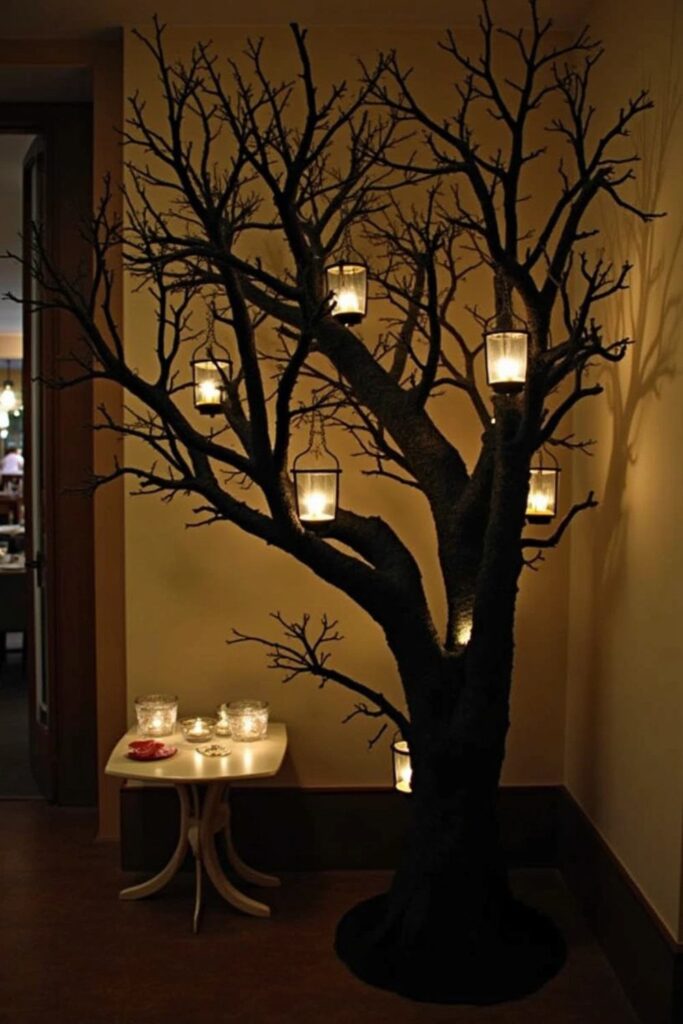 Use a dark, twisted tree as the base and decorate it with glowing leaves for a magical ambiance.