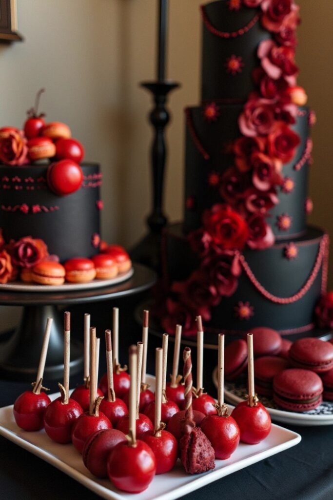 Design a decadent dessert table that looks straight out of a dark fairytale. Include treats like “poison apple” cake pops, black macarons, and a bold wedding cake with cascading dark blooms.