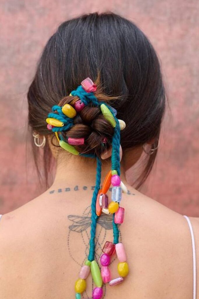 A wrapped bun with beads can add a creative and artistic touch to your work hairstyle. Begin by gathering your hair into a low bun and securing it with an elastic. Then, wrap colorful beads or fabric around the bun to give it a splash of visual interest and texture.