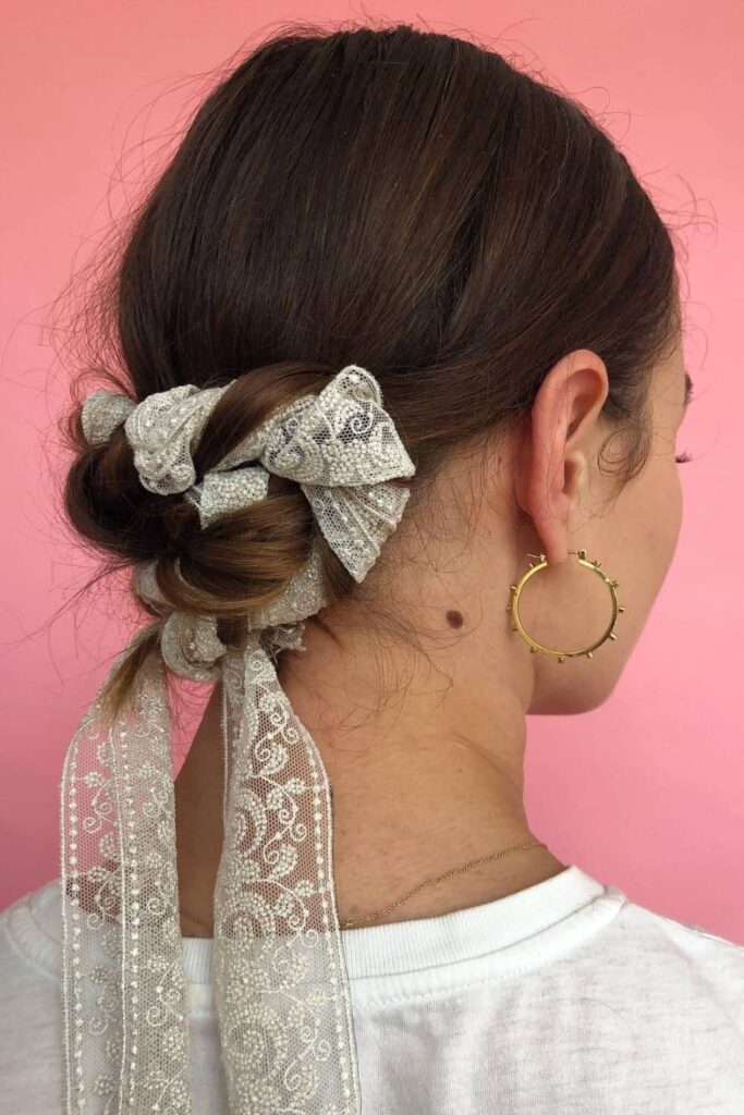 Transform your everyday look with the braided low bun with ribbon – a hairstyle full of elegance and charm. Begin by braiding your hair, then twist it into a low bun at the back of your neck.