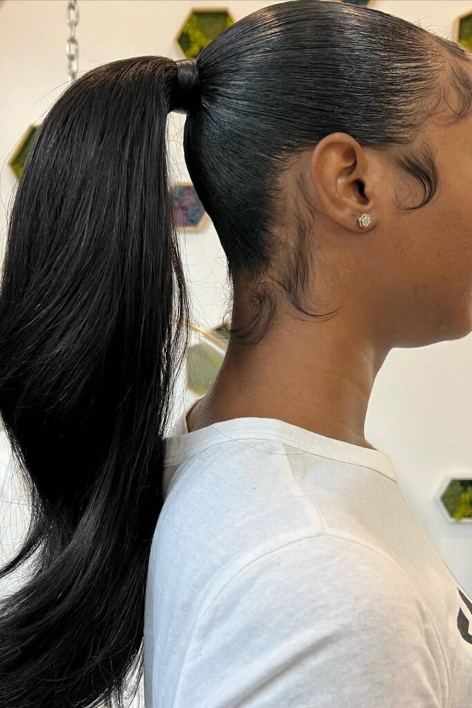 This hairstyle keeps your hair neatly away from your face, ensuring a tidy and clean appearance all day. The sleek high ponytail is particularly effective on dirty hair, as the natural oils contribute to its smooth effect.