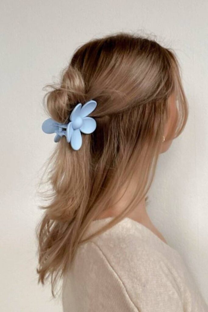 Achieve a quick, professional appearance with the half-up claw clip style, perfect for masking oily roots. Gently gather the top portion of your hair, giving it a slight twist, and secure it at the back using a claw clip.