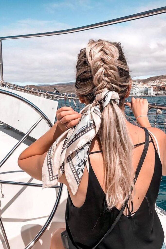 Transform your everyday look with a Braided Ponytail with Scarf. Begin by weaving a simple French or Dutch braid from the top of your head to your neck. Once you reach the nape, secure the braid into a ponytail.