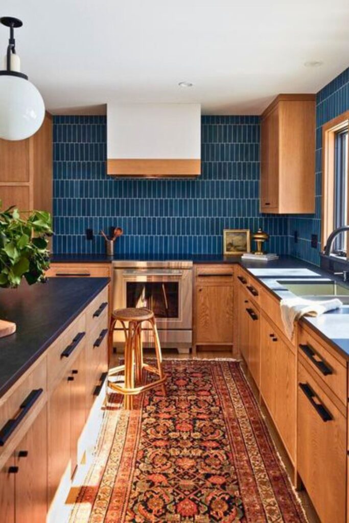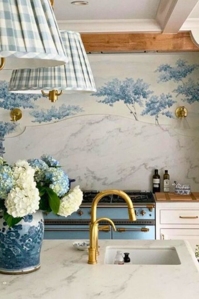 The striking blue tones bring depth and visual interest, especially when combined with wood cabinetry and gold hardware.