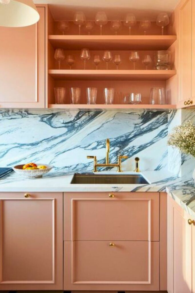 Achieve a chic, modern design by pairing a striking marble slab backsplash with pink cabinetry. Use a large marble panel with dramatic veining for a seamless look.