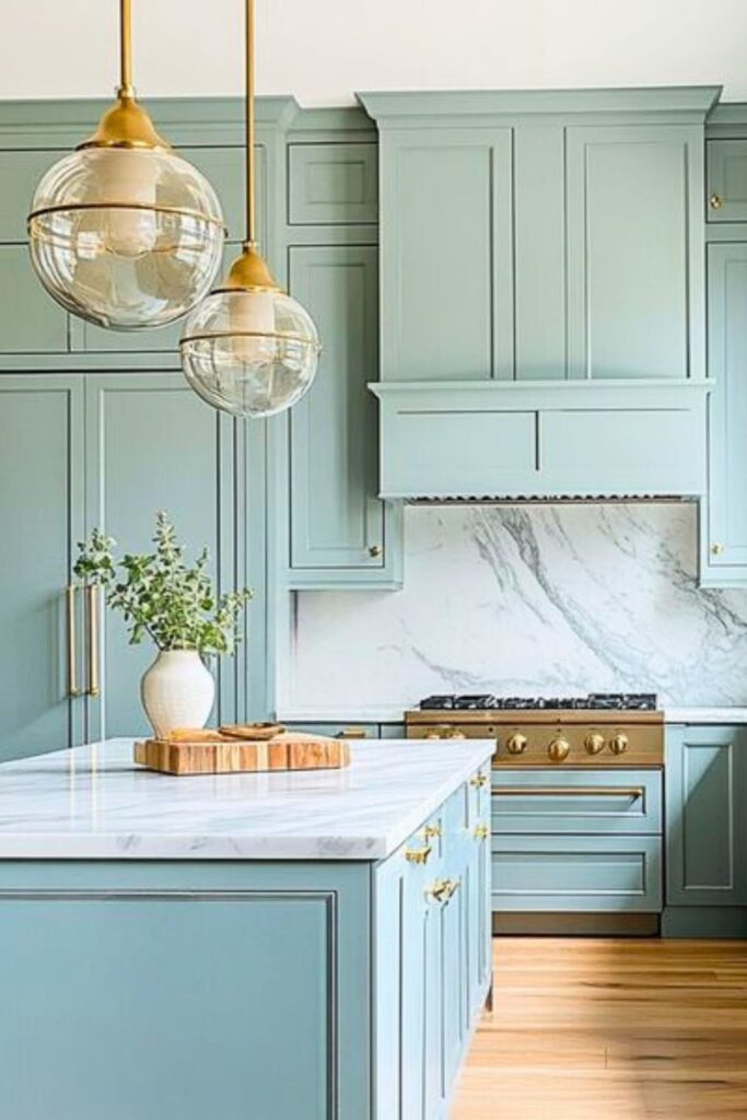 Create a serene kitchen atmosphere with a light blue marble backsplash that exudes elegance.