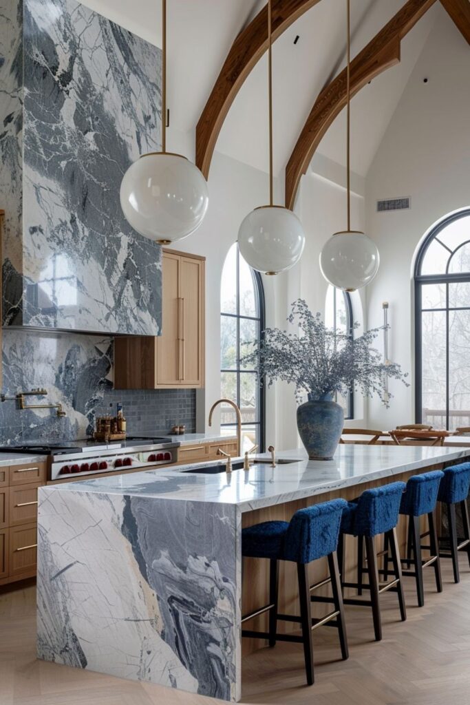 Make a dramatic statement with a blue marble slab featuring bold veining. Extend this stunning backsplash onto the vent hood or nearby walls for a grand, cohesive effect.