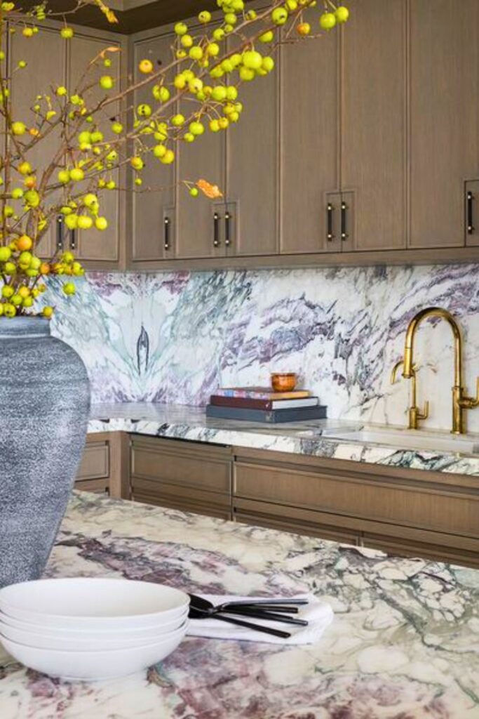 A purple and green veined marble backsplash creates a breathtaking and unique design. The intricate veining forms a natural artwork, making this backsplash the focal point of any kitchen.