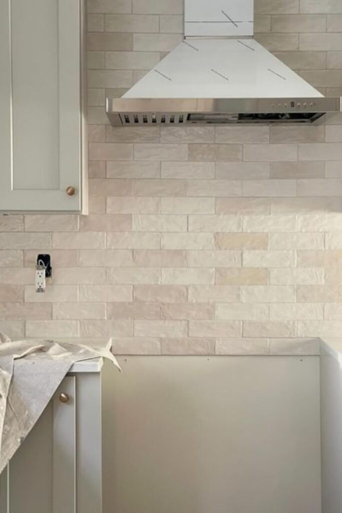 For a soft, cozy kitchen design, choose off-white tiles arranged in a charming brick pattern. The slight variations in tone and texture lend a handcrafted feel to the space.