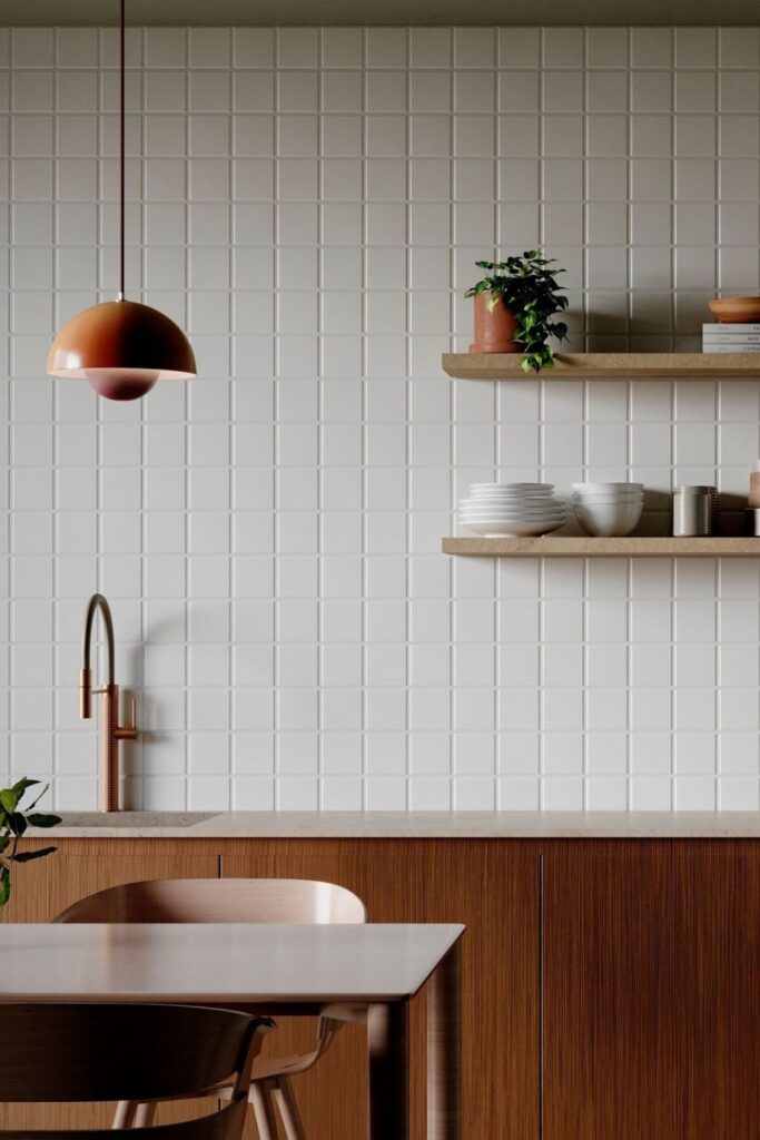 Achieve a clean and contemporary look with small white square tiles arranged in a meticulous grid pattern. This minimalist design pairs beautifully with wood cabinetry and floating shelves.